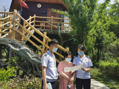 (圖為南京稅務(wù)干部在巴布洛生態(tài)谷向游客解讀最新的稅費(fèi)優(yōu)惠政策)