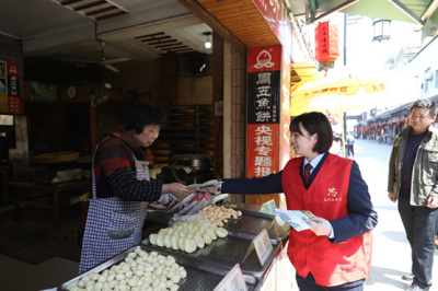 (圖為姜堰稅務(wù)志愿者在溱潼老街向沿街商鋪發(fā)放稅費(fèi)政策宣傳冊(cè))