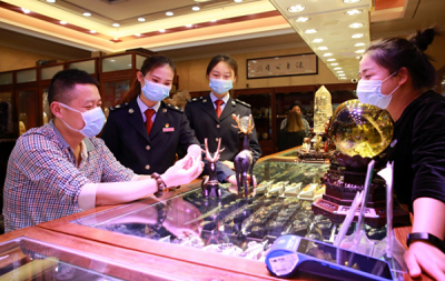 (圖為東海縣稅務(wù)干部在“水晶小鎮(zhèn)”向商戶宣傳稅費(fèi)政策)